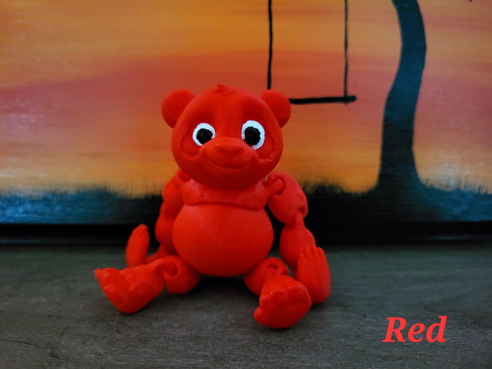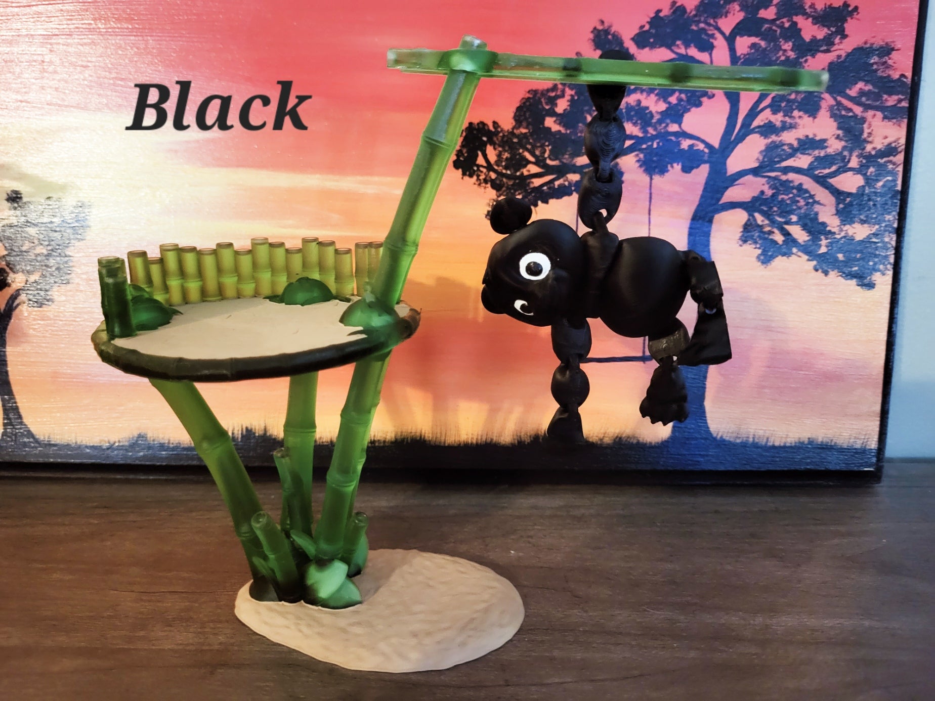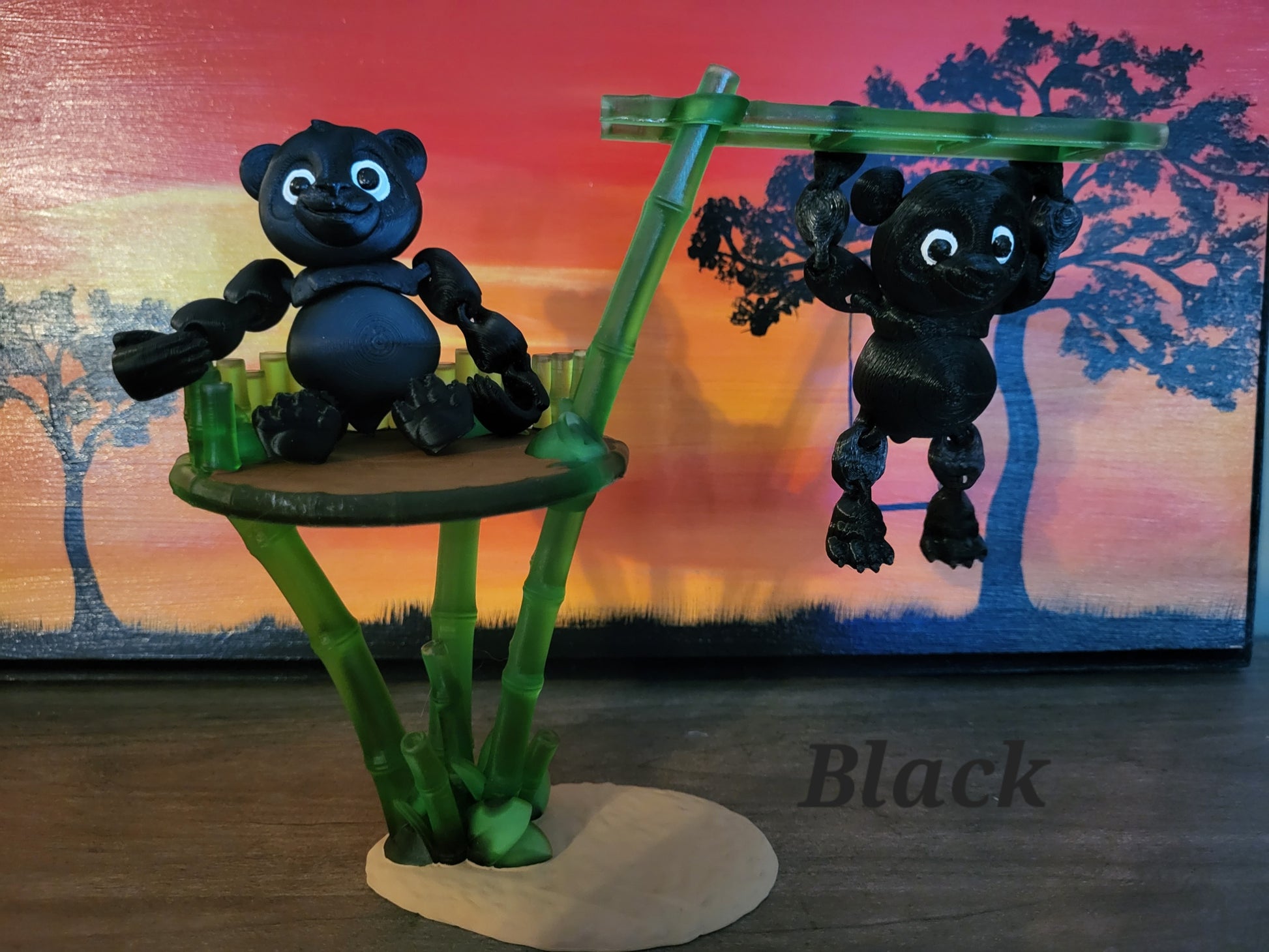 The Panda is so cute and they come with their very own play set as well. The panda is printed in pla and the play set is printed in resin. The play set will be translucent green and I paint the ground sand color and the top of the play set dark brown like boards. The panda has hooks for hands so that they can hang from the ladder. Their back feet are normal. They can also sit up on their play set. These little guys are super fun to have chill on your desk and be able to position them in all different ways.Â